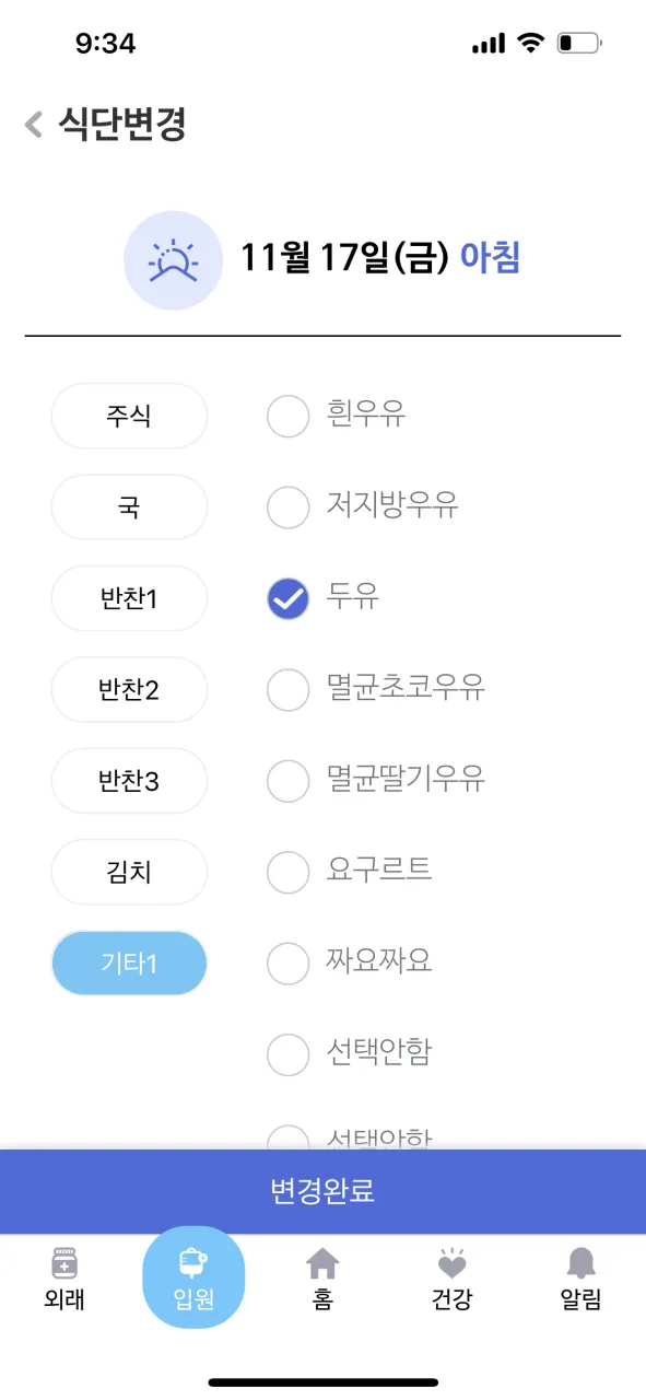 목요일 아침과 점심은 입맛이 전혀 없어서 먹지 않았습니다. 제가 밥 먹는 것을 힘들어하자 간호사님이 간염식단이 아니라 자유식단으로 먹을 수 있게 해 주셨습니다. 그래서 저녁에는 저도 다른 환자들처럼 어플로 메뉴를 자유롭게 선택하여 식사를 받았습니다. (어플로 메뉴를 고르는 방법은 아래에 설명드리겠습니다.) 제가 고른 것은 잡곡밥 반공기와 숭늉, 동치미, 계란 프라이 반찬입니다. 숭늉이 아주 입에 잘 맞아서 밥알을 다 긁어먹었고 계란 프라이 하나도 깔끔하게 다 먹었습니다.