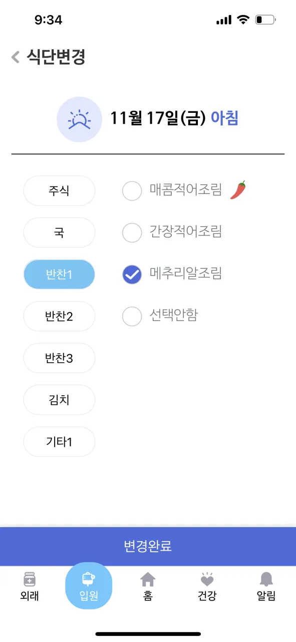 식단 선택 화면에서 아침, 점심, 저녁 중에 하나를 고릅니다. 식단 선택 마감 시각은 아침은 오전 5시, 점심은 오전 10시, 저녁은 오후 3시 30분까지입니다.