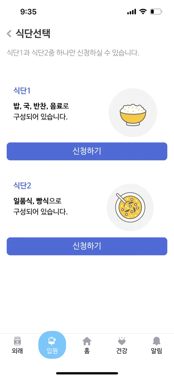 만약 식단 1과 식단 2 중 일품식인 식단 2를 선택할 경우 다음과 같은 선택화면이 뜨는데요. 금요일 아침의 메뉴는 햄버거와 고구마타락죽이었습니다. 일품식 메뉴는 계속 바뀌니 식욕만 있다면 덜 병원밥스러운 음식도 충분히 먹을 수 있을 것 같습니다.