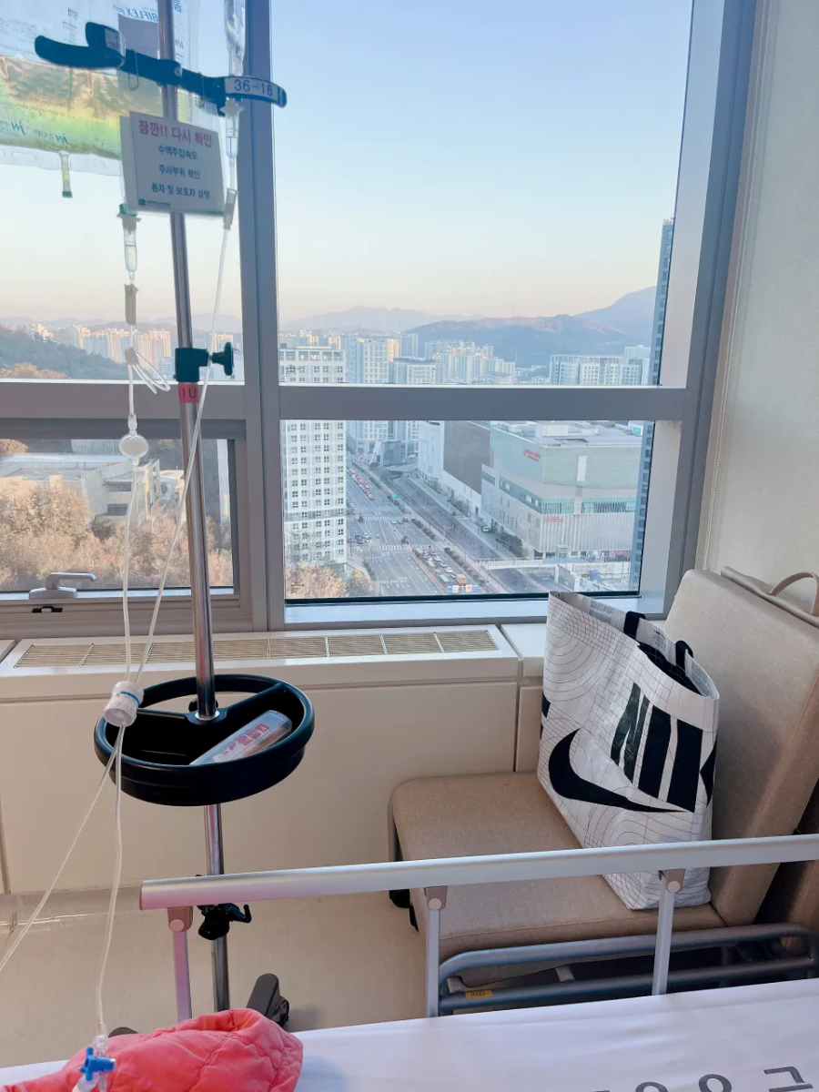 앞베드에 계신 환자분이 퇴원하셔서 아무 짐도 없는 모습을 찍어보았는데요. 보시다시피 넓고 깨끗합니다. 또, 창가자리는 전면창이라 엄청 밝습니다.