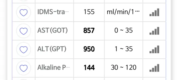 감기는 나았지만 속 울렁거림이 점점 심해져서 위장약 처방을 받으러 동네 내과에 다녔는데요. 제가 b형 간염 보균자라는 사실을 아는 의사 선생님께서 혹시 모르니 피검사를 하는 것이 좋겠다고 해서 피검사를 했습니다. 저는 이때만 해도 간수치가 상승했으리라는 생각은 못했고 위장약이 잘 듣기만을 바랐습니다. 그런데 하필 피검사를 한 날이 금요일이라 그다음 주 월요일에 결과를 알게 되었는데요. (이 때는 이미 입원 중) 이때의 간수치는 다음과 같았습니다.