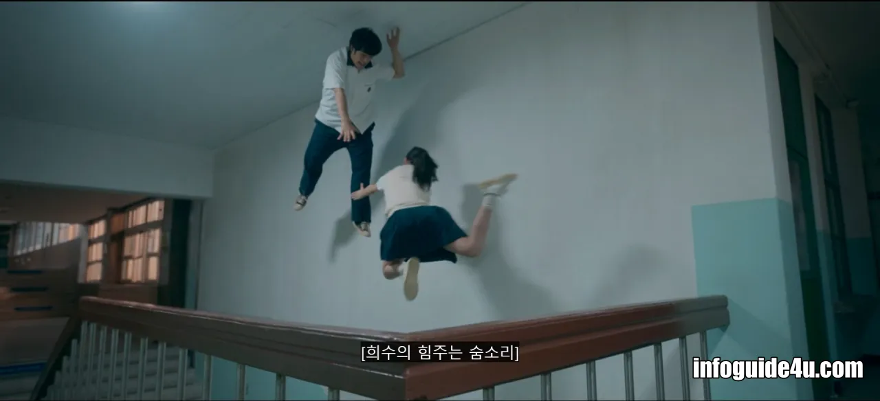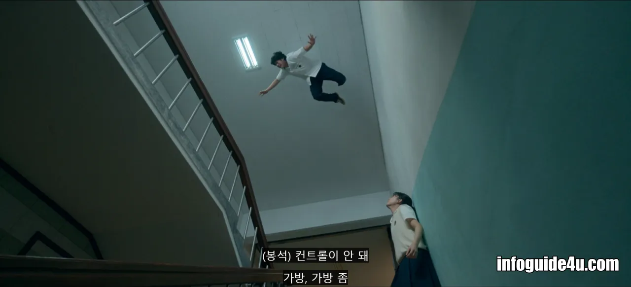 희수의 도움으로 봉석은 겨우 계단으로 내려앉았지만 무거운 가방을 멨는데도 다시 몸이 떠오르기 시작합니다.