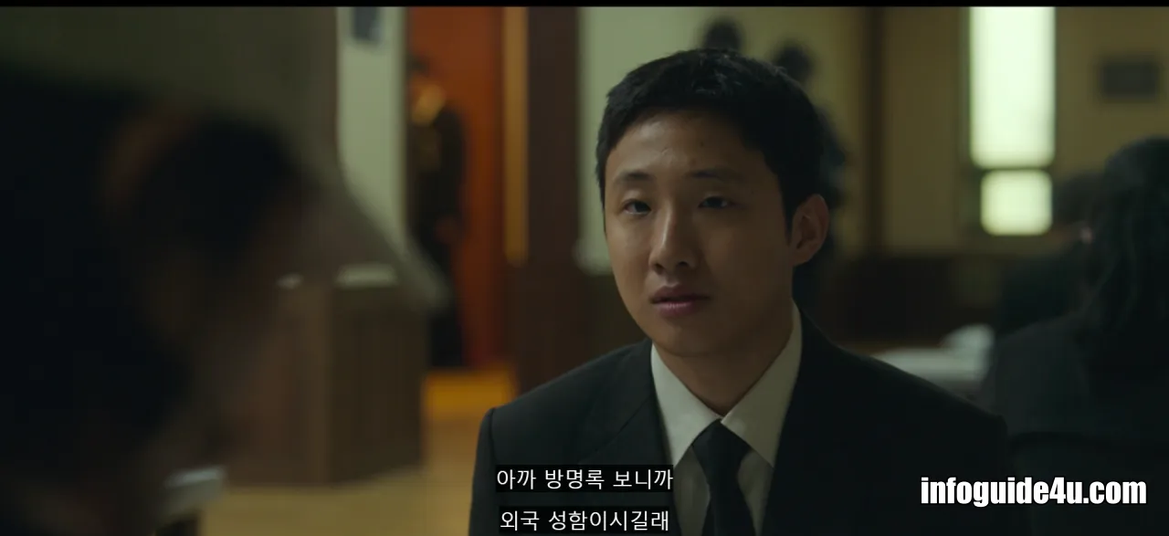 방명록에 Frank라고 적힌 이름을 보고 나주의 아들은 프랭크가 교포냐고 묻습니다. 프랭크는 입양되었다(Adopted)고 말합니다.