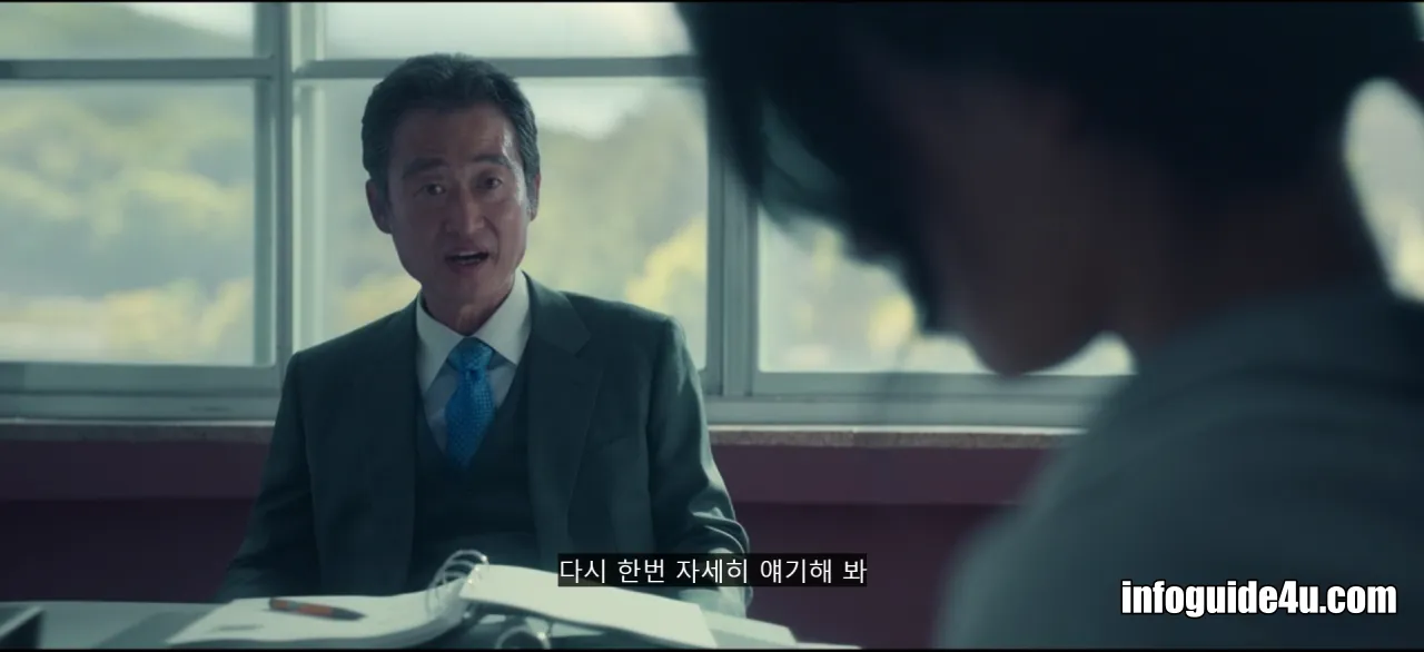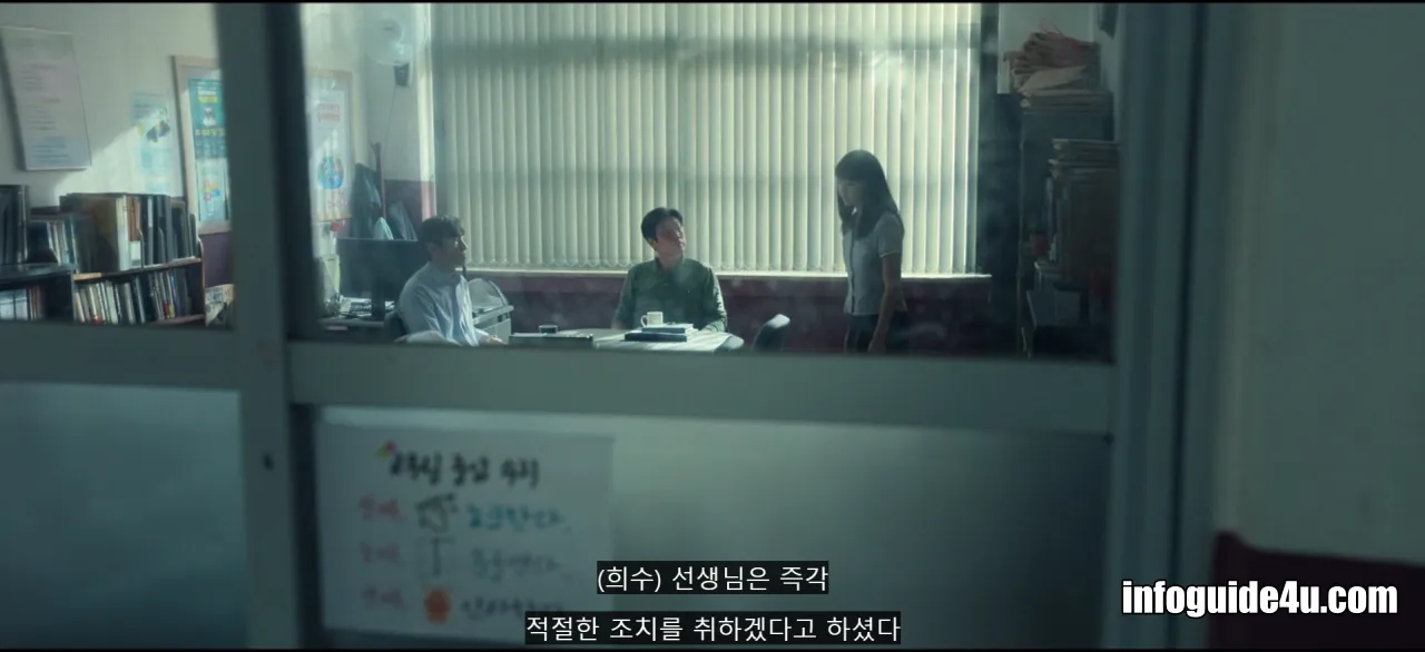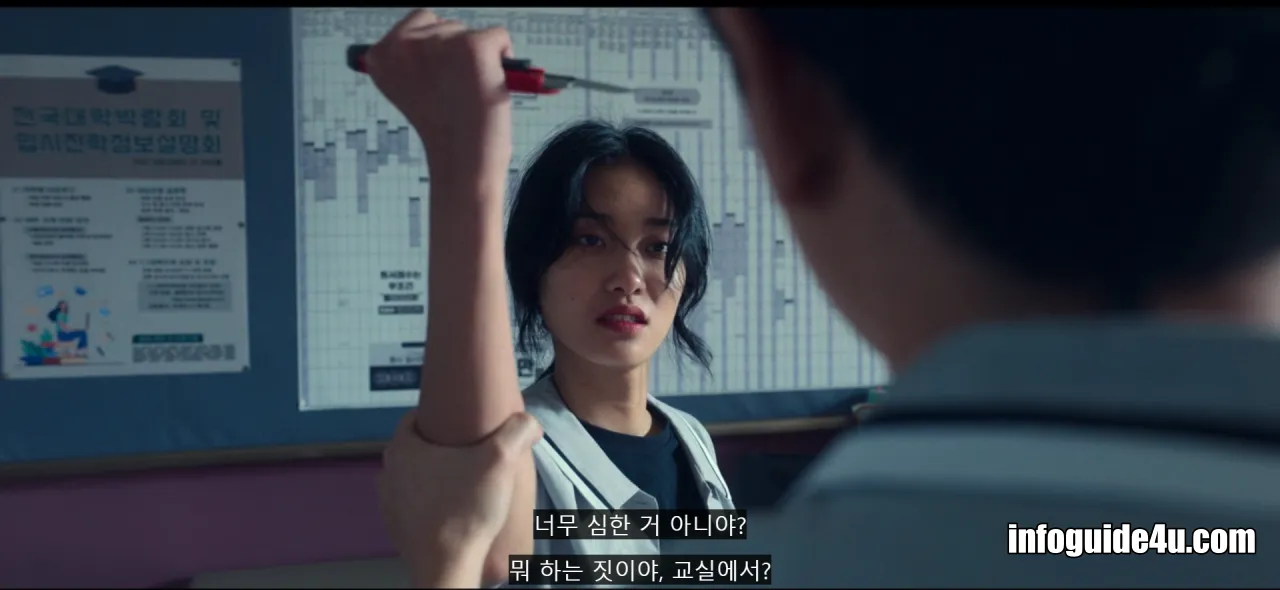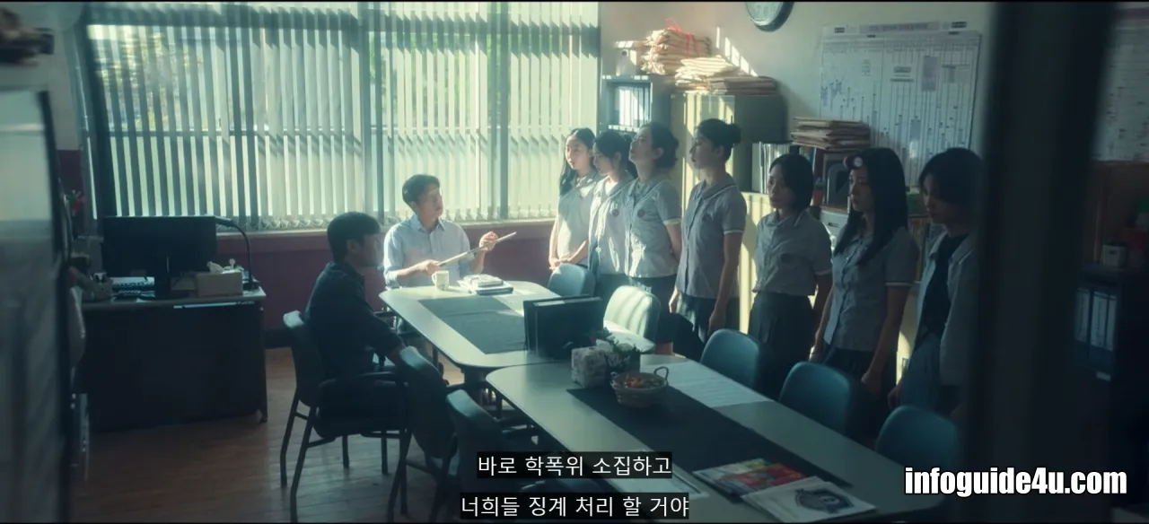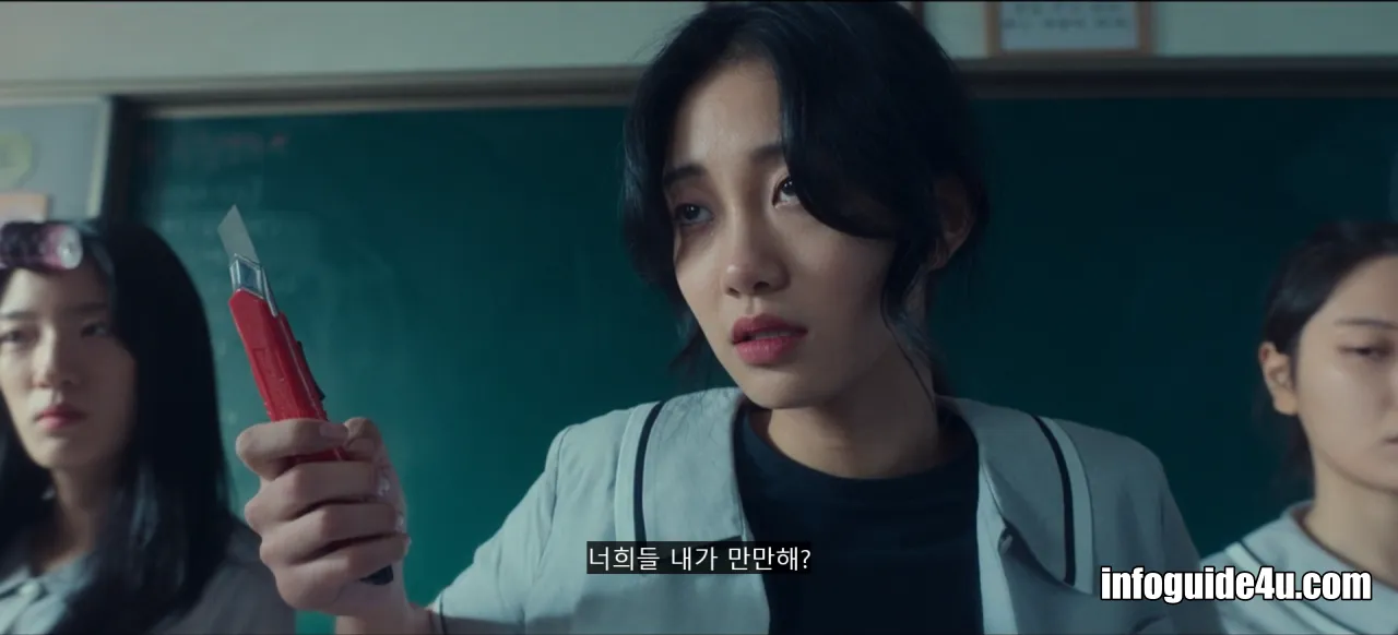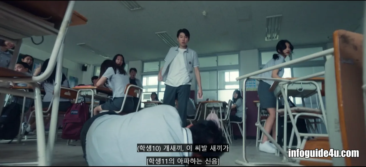 한편 자신이 별다른 이유없이 교사에게 찍혔다고 생각하는 일진 우두머리는 칼을 들고 학급 친구들을 협박하며 누가 찌른 거냐고 말하라고 합니다.