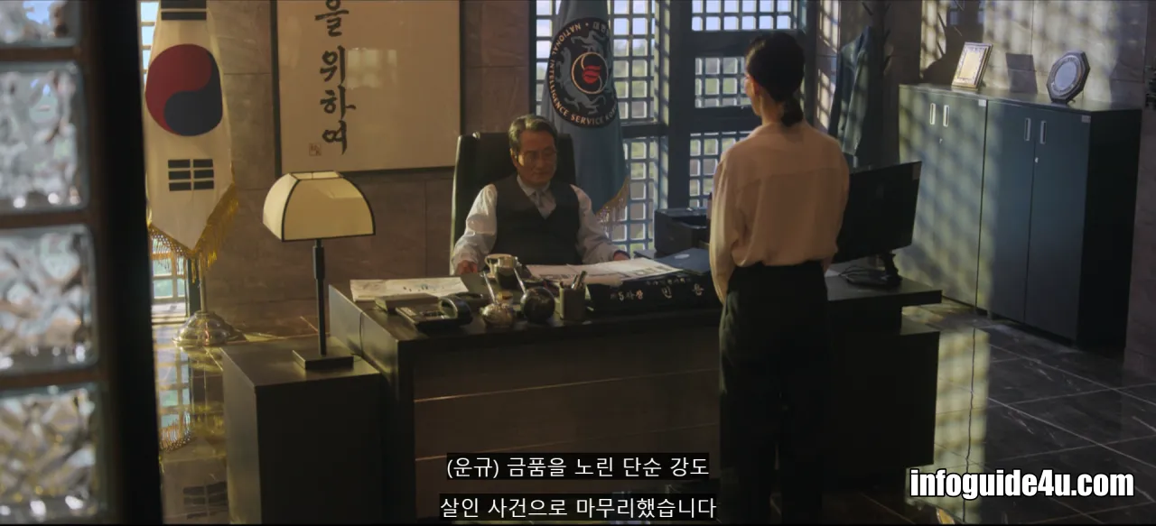 한편 국정원에서는 엔젤헤어 살인사건을 어떻게 처리했는지 보고가 이루어지고 있었습니다. 사건은 금품을 노린 단순 강도 살인 사건으로 마무리되었습니다.