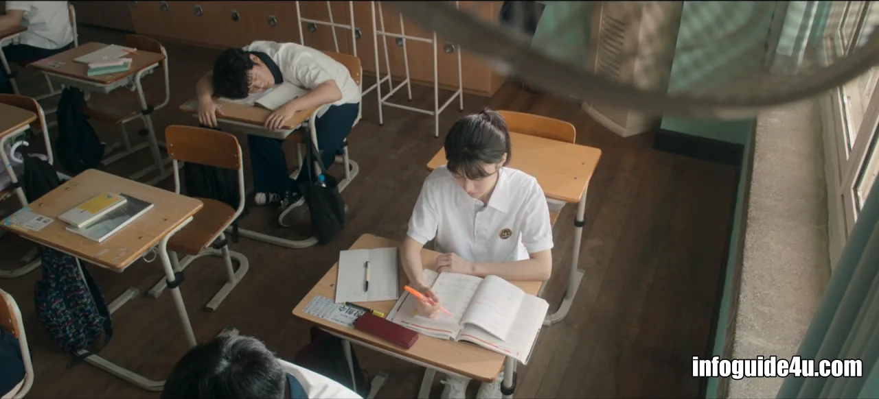 현재의 희수는 고3이 되었습니다. 희수는 교실에 앉아 영단어 공부를 하고 있습니다.