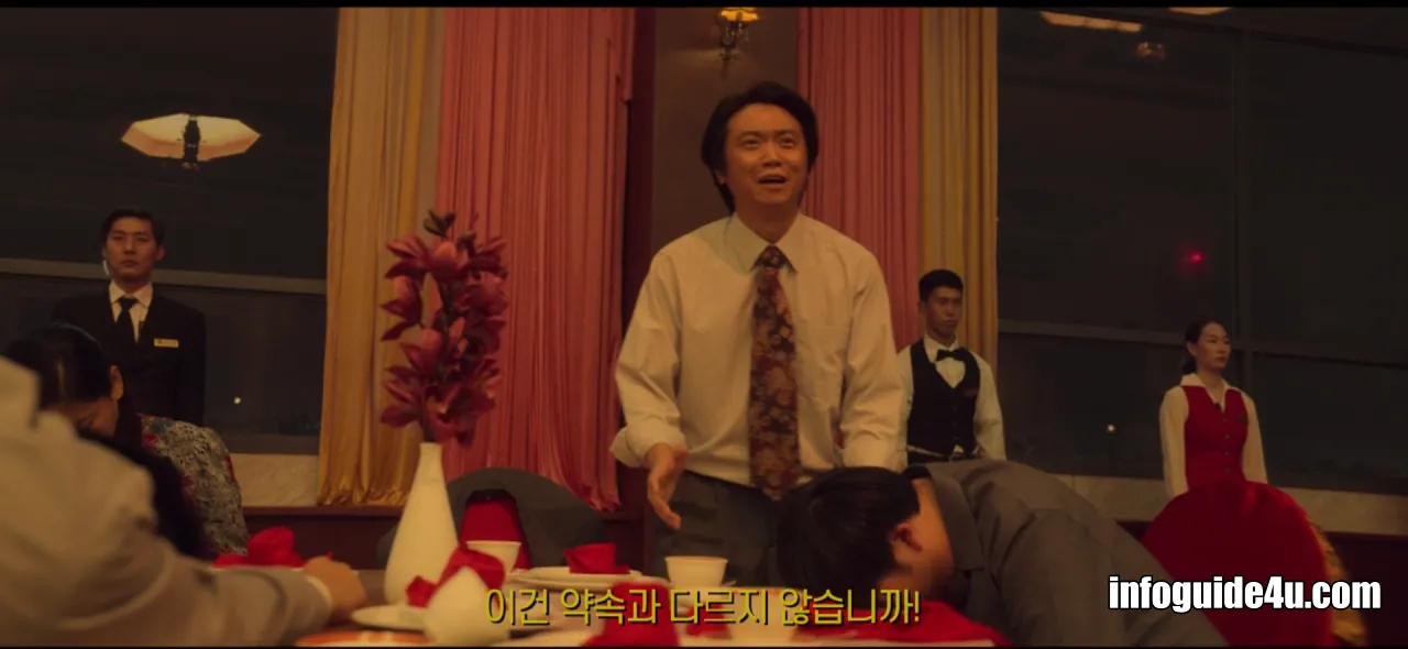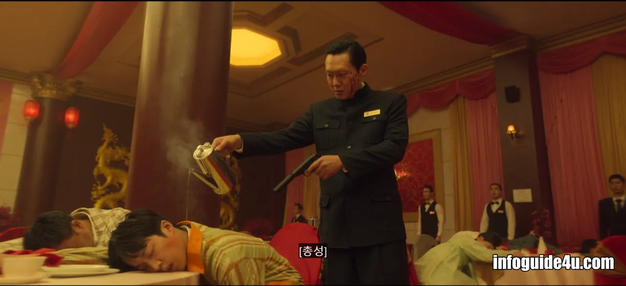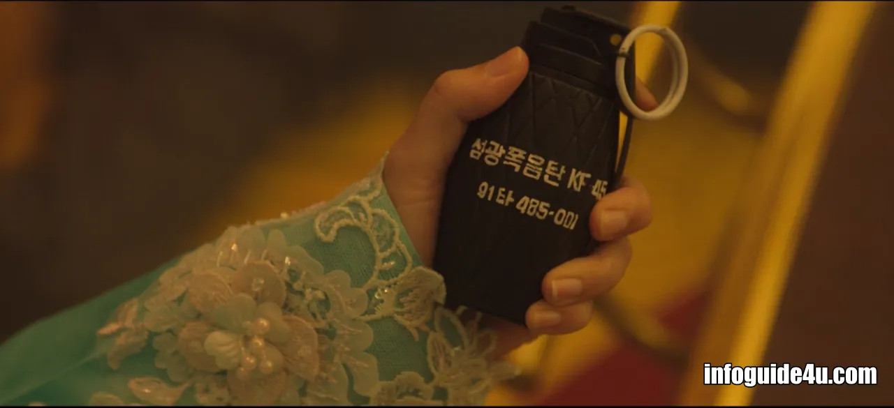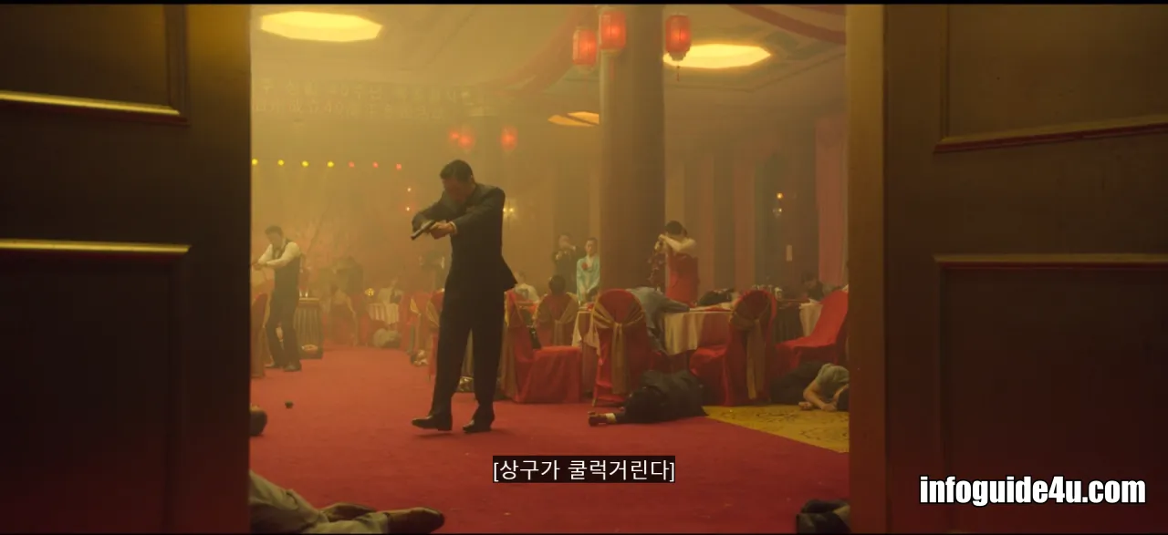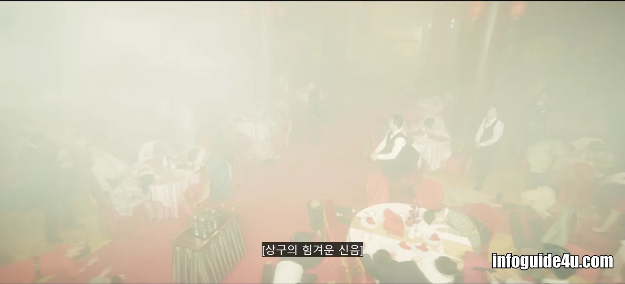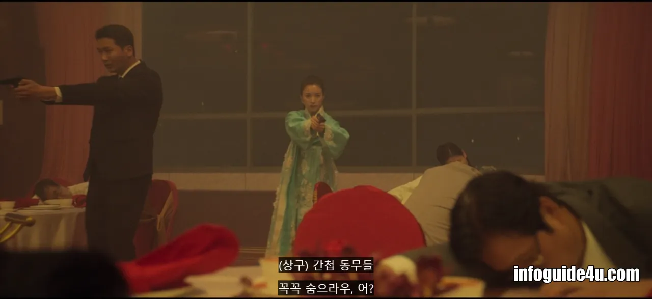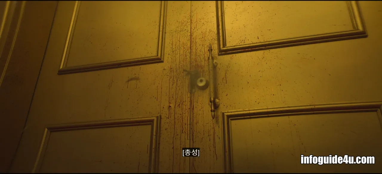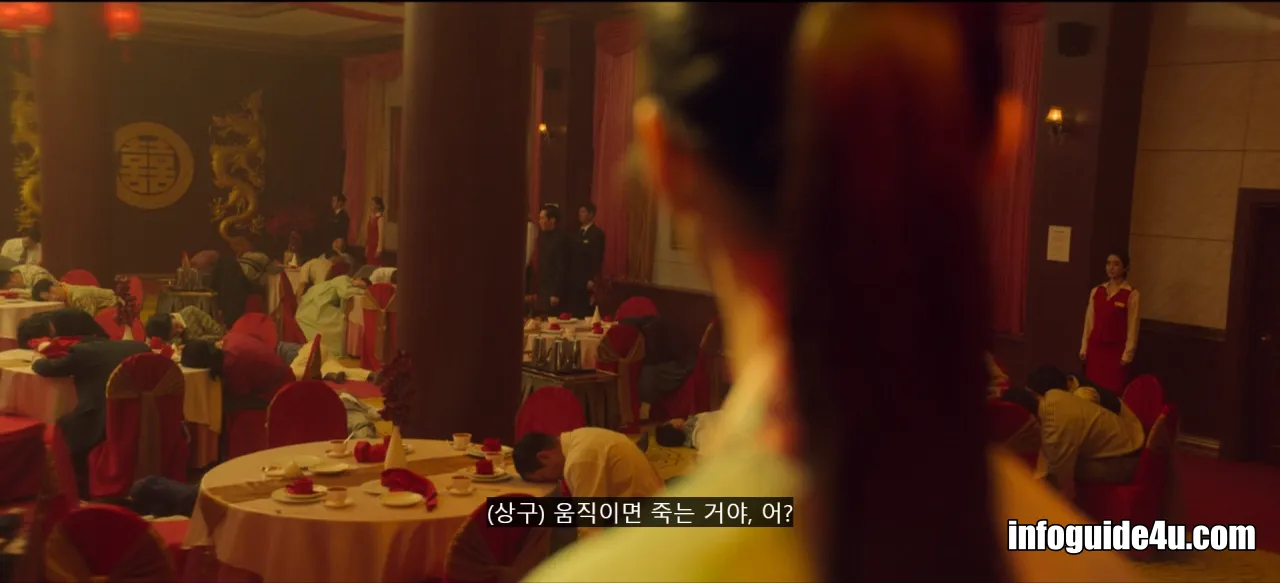 다시 연변의 호텔로 화면이 바뀝니다. 미현은 연회장에 있는 모든 사람들 중에서 유일하게 섬광폭음탄의 영향을 받지 않고 문을 볼 수 있는 사람이었습니다.