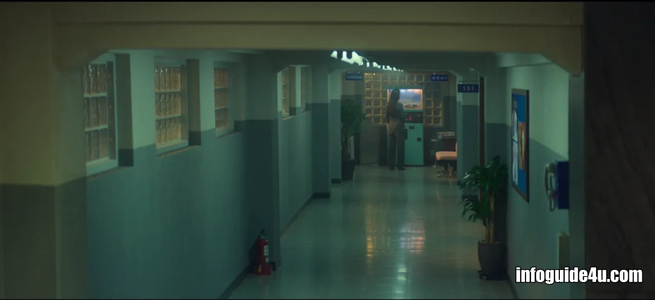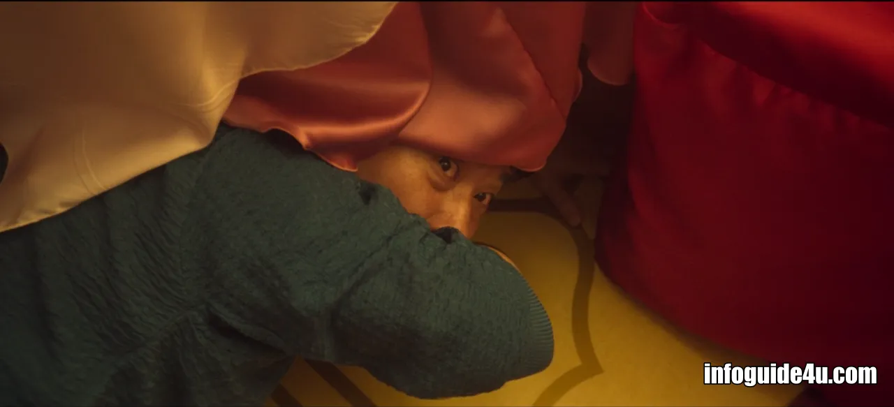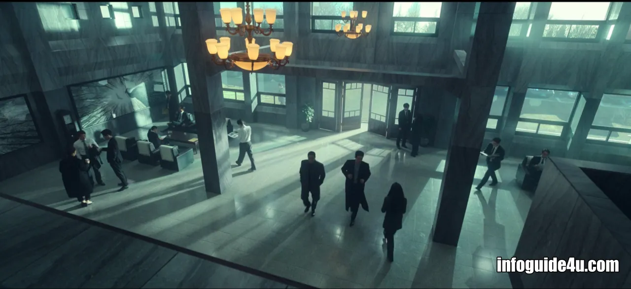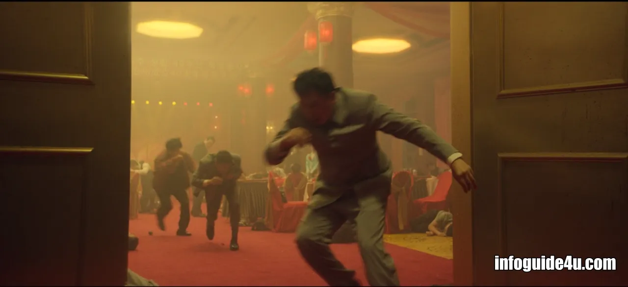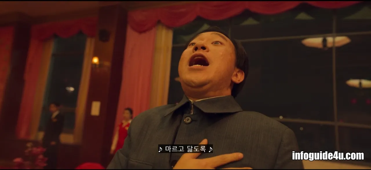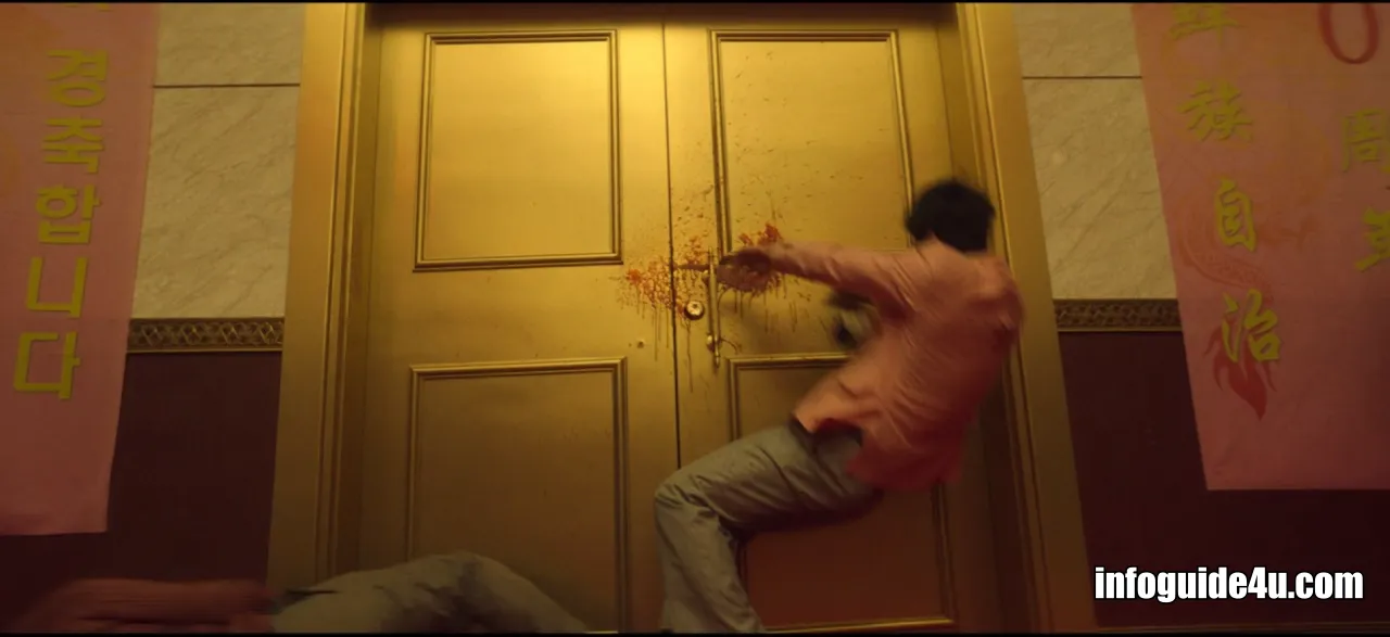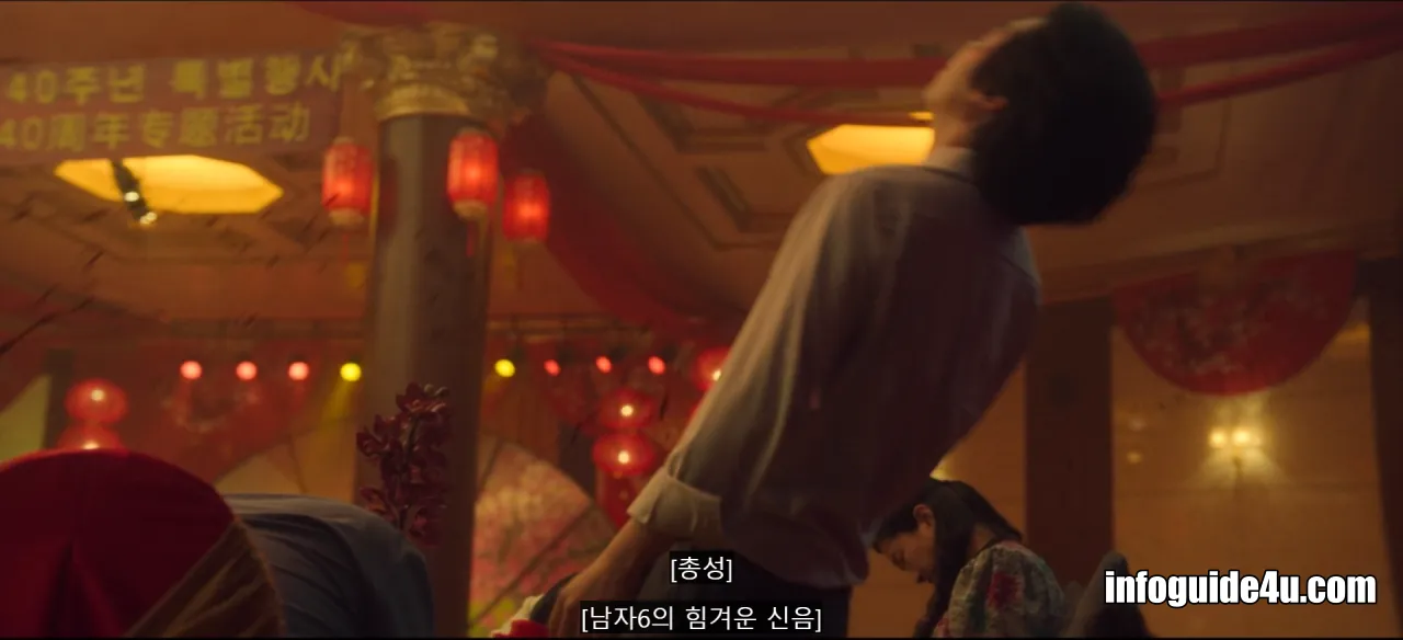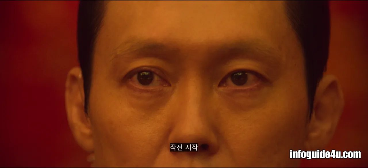 다시 연변의 호텔로 화면이 바뀝니다. 미현은 연회장에 있는 모든 사람들 중에서 유일하게 섬광폭음탄의 영향을 받지 않고 문을 볼 수 있는 사람이었습니다.