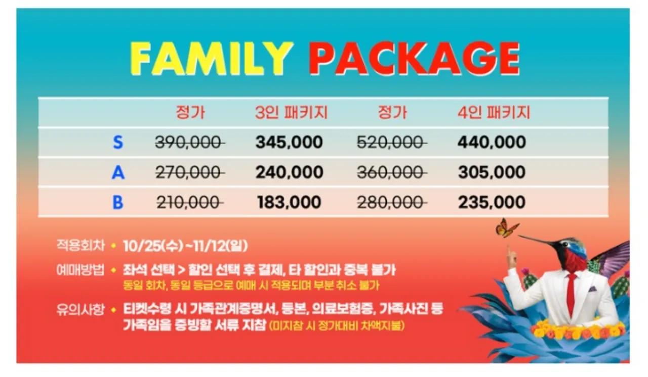 ▶ 티켓 가격: VIP석 290,000원, SR석 190,000원, R석 160,000원, S석 130,000원, A석 90,000원, B석 70,000원