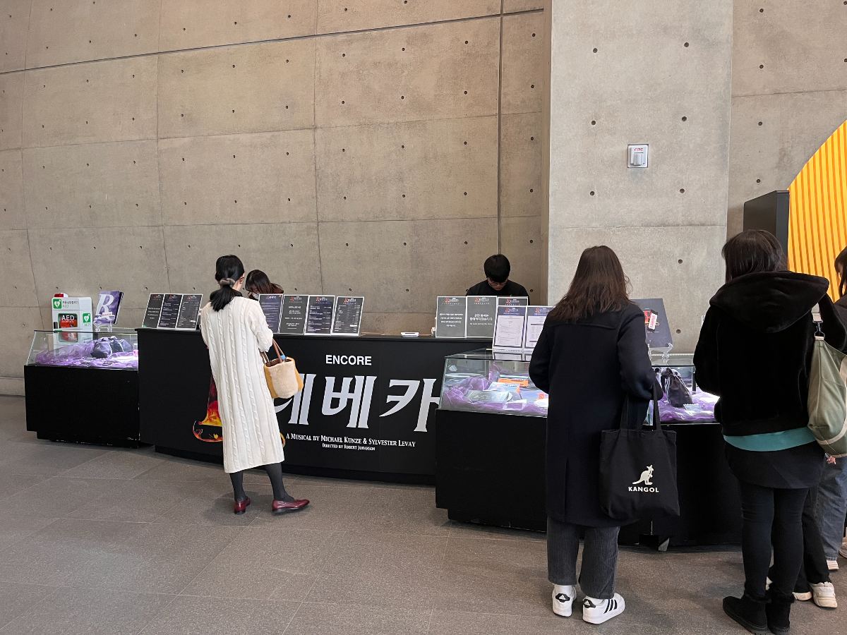 에스컬레이터를 타고 올라오면 우측에는 레베카 간판이 보이고 앞으로는 높은 천장의 1층 로비가 등장합니다. 레베카 공연을 진행하는 시그니쳐홀은 우측에 있으며 좌석이 2층인 경우는 좌측에 보이는 에스컬레이터를 타고 2층으로 이동하면 됩니다. 기둥 뒤쪽으로는 티켓박스, 물품보관소, 편의점, 무인발권기, 주차정산기가 있습니다. 화장실은 시그니처홀 지하 1층과 2층에 있습니다.